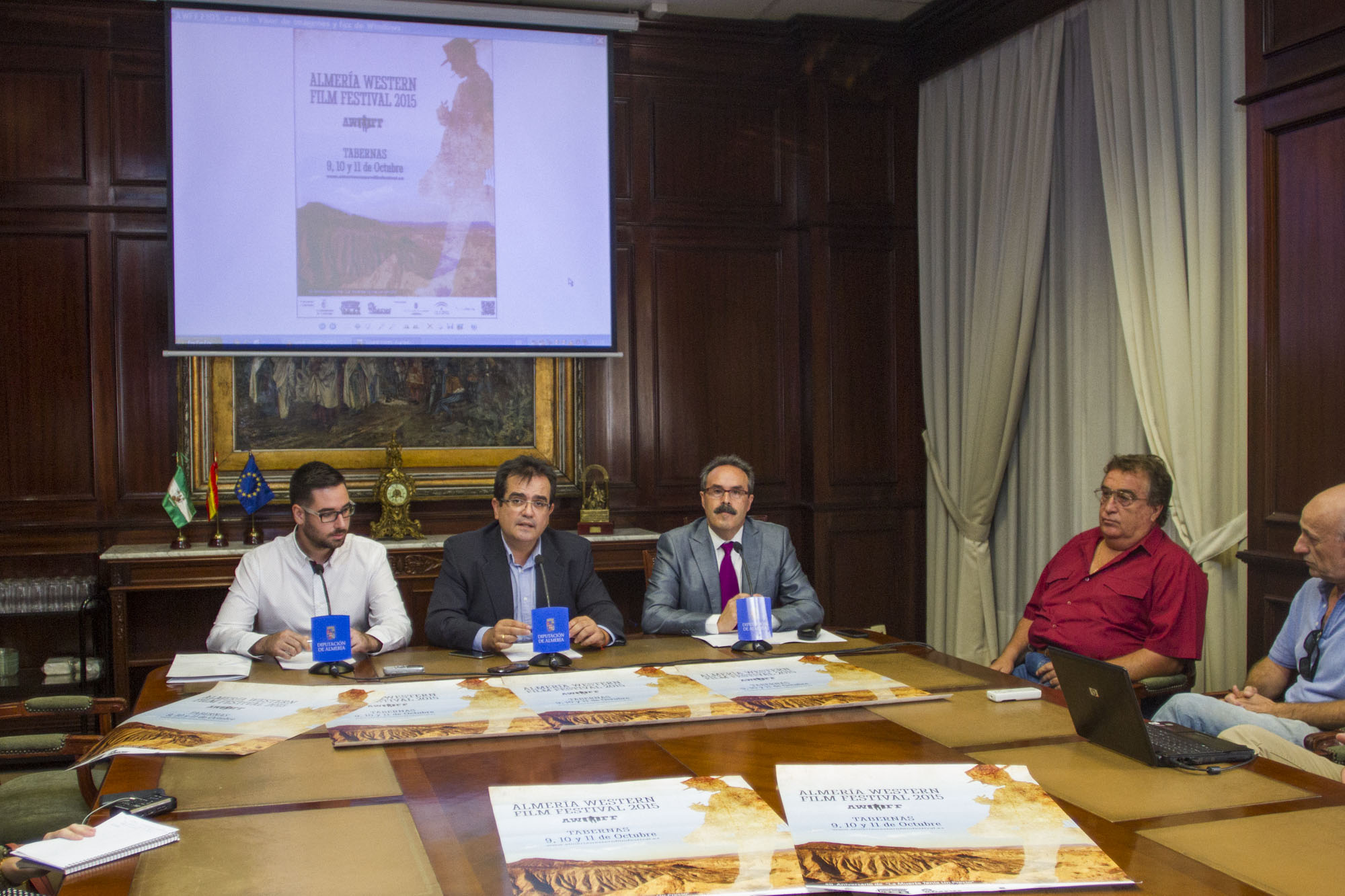 Almería, 16 de septiembre de 2015 -. El Ayuntamiento de Tabernas, entidad organizadora del Almería Western Film Festival (AWFF), ha presentado esta mañana en la Diputación de Almería la próxima edición del Festival que se celebrará del 9 al 11 de octubre de 2015 en el municipio tabernense y los poblados Fort Bravo y Oasys Mini Hollywood. AWFF contará con el preestreno en España de “Deuda de honor”, una película dirigida por Tommy Lee Jones, que está protagonizada por el propio Jones, Hilary Swank y Meryl Streep, entre otros. El actor Rodolfo Sancho será el invitado de honor que asistirá al homenaje “in memoriam” que se realizará a su padre Sancho Gracia por su larga y exitosa trayectoria como actor y su aportación al cine rodado en Almería.